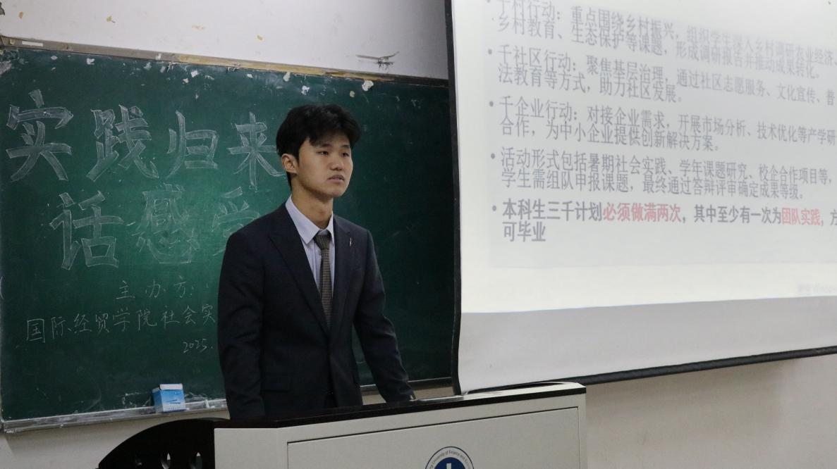 历年主要成就”等关键维度。宣讲过程中同步播放“三千计划”宣传纪录片,直观生动的画面加深同学们的认知。他详细拆解了“三千计划”完整实践流程,针对立项申报、前期准备、实践开展、成果提交等七个阶段,逐一明确各环节的核心任务、工作重点与时间节点,清晰勾勒出社会实践的整体流程,帮助同学们全面把握不同阶段的推进逻辑与实施要点。