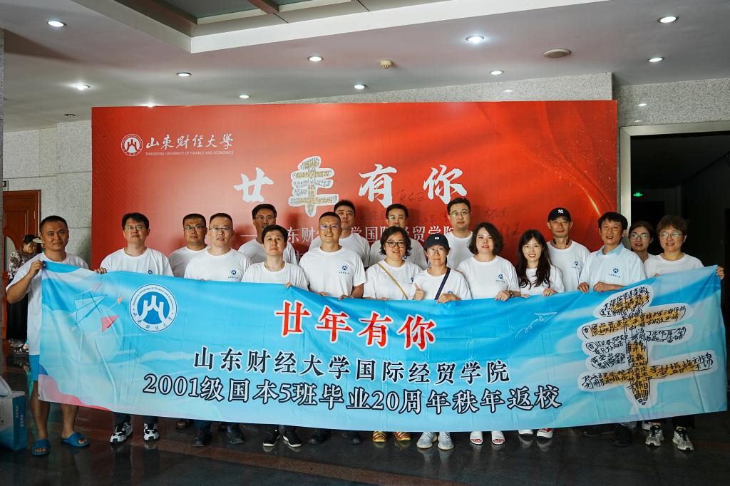 2001级国本5班的校友相聚舜耕校区,参加“廿年有你”毕业20周年秩年返校活动。
