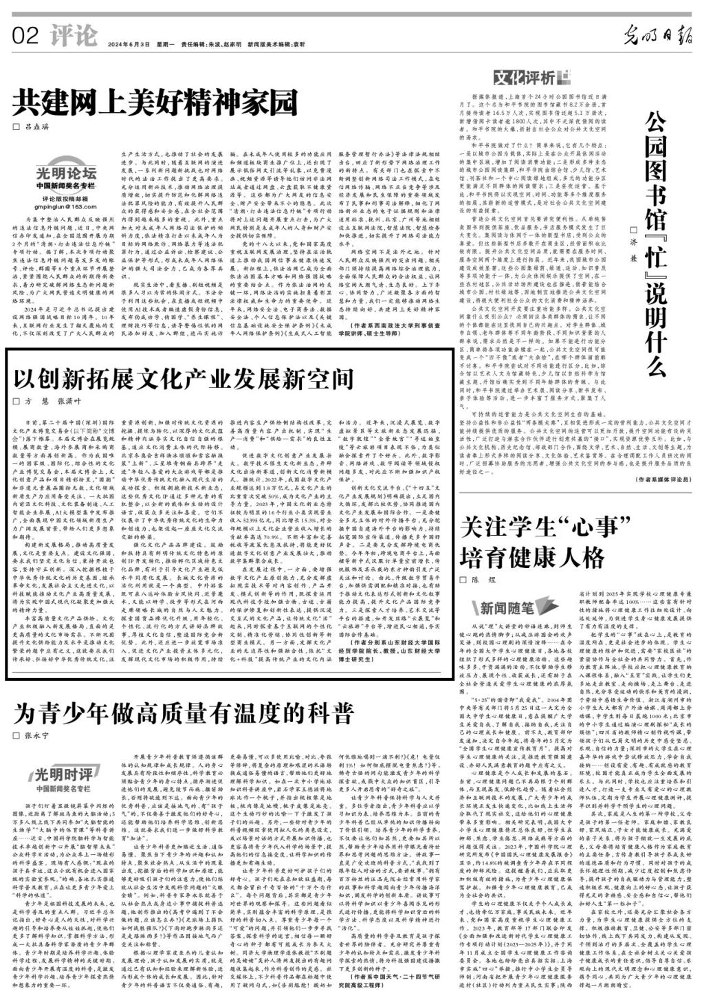 6月3日,方慧院长与本院博士研究生张潇叶合作撰写的文章《以创新拓展文化产业发展新空间》在《光明日报》发表。