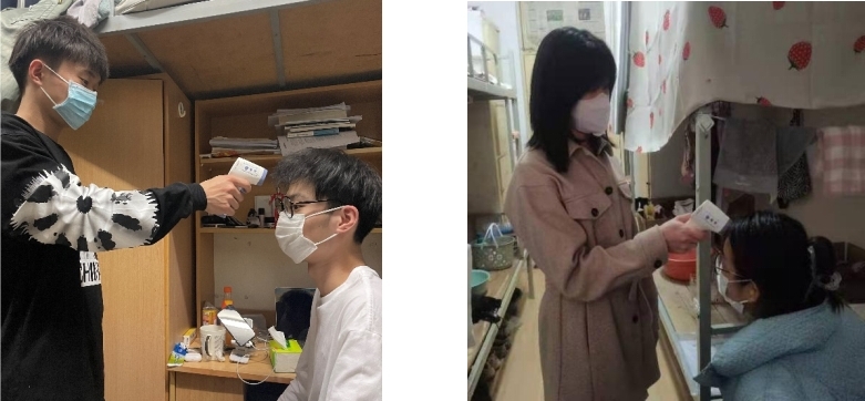 此外,志愿者们每晚都在严格做好自身防护的前提下,去到每个学生宿舍为大家测量体温,认真记录每个宿舍每位同学的在校情况,做好体温统计、在校人数核对等工作,及时向学院反馈。