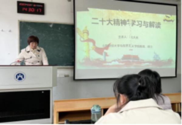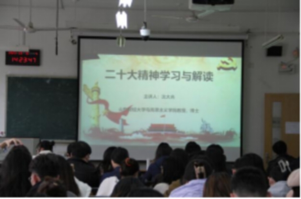 学习宣传贯彻党的二十大精神宣讲团成员、原马克思主义学院院长沈大光教授为支部师生宣讲二十大精神,支部书记王斐斐、支部副书记李瑞雪和研究生党支部党员四十余人一同参加宣讲活动。