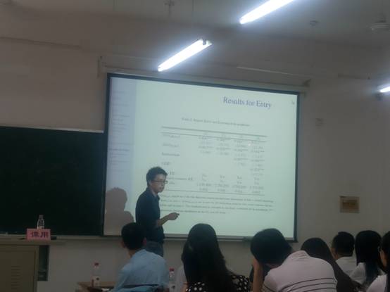 谭用博士主要从进口的角度分析了“neighbors effect”。首先通过建立一个信息处理学习模型,分析进口企业如何利用其它企业(在同一国市场进口的企业)的进口价格和进口企业数量等信息判断国外市场价格。根据模型预测,当周边邻居进口数量越多时,企业从该国进口的可能性越大。然后谭用博士依据2000-2006年的海关数据对模型进行验证,数据有力的证明了模型预测结论的正确性。并且在进行了一系列的回归分析及稳健性检验之后,结论依然成立。最后谭用博士与我校师生进行了互动,针对我校师生提出的关于“search ability”指标的选取和稳健性检验等问题进行了一一解答。